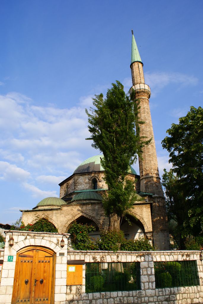 Eine der Brücken über die Miljacka. Aufgrund der zahlreichen fotografierenden Touristen auf der Brücke nahm ich an, dass es sich um die Lateinerbrücke handelt. Auf der Lateinerbrücke wurden der österreich-ungarische Thronfolger Franz Ferdinand und seine Frau von einem serbischen Attentäter erschossen, was einer der Auslöser des ersten Weltkriegs war. Leider stelle ich gerade fest, dass ich die falsche Brücke fotografiert habe. Die Lateinerbrücke liegt 300 m westlich von der hier abgebildeten Brücke.