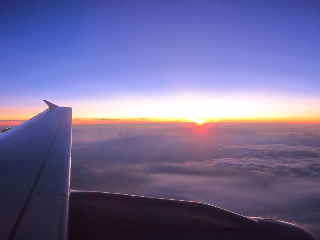 Ich saß auf der linken Seite, so dass ich während des Flugs in nördliche Richtung der untergehenden Sonne zusehen konnte. Sonnenauf- und Sonnenuntergänge vom Flugzeug aus betrachtet sind für mich immer wieder ein phantastisches Erlebnis.