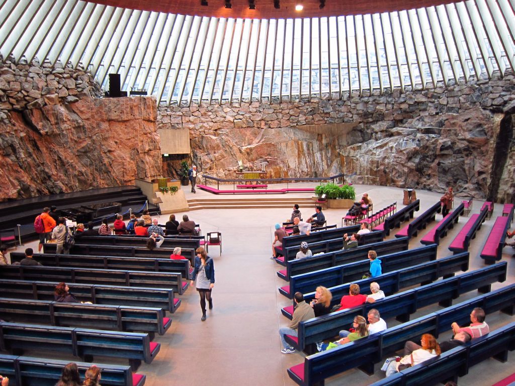 Die Kirche im Stadtteil Töölö wurde in den Felsen gehauen und besitzt ein Stahldach und zahlreiche streifenförmige Fenster.