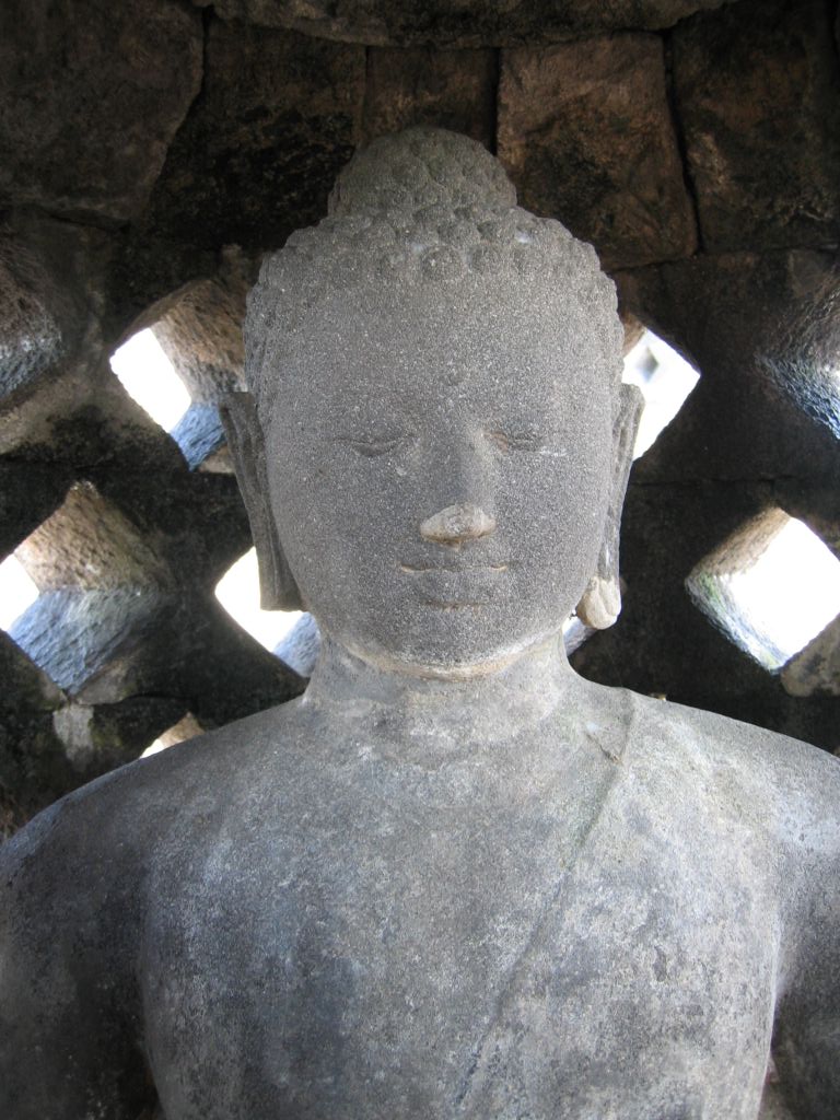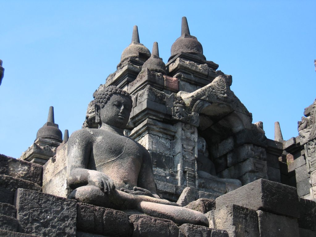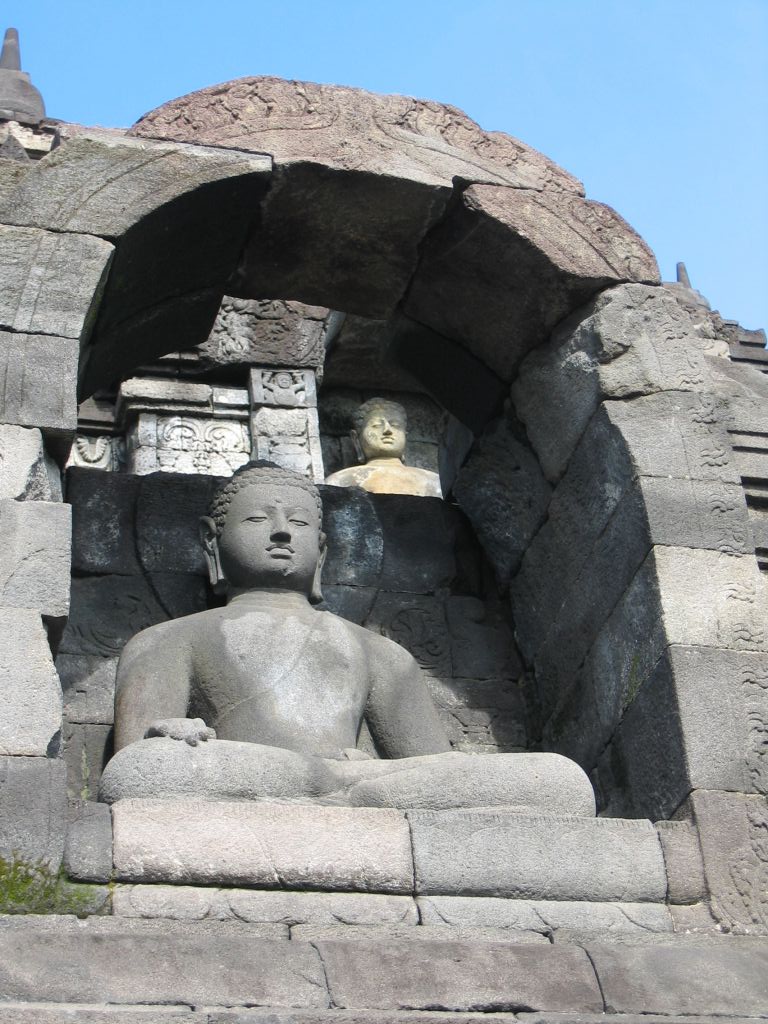 Auf der untersten Ebene ist man noch an die Welt gefesselt. In der obersten Ebene landet man im Nirvana. Es gibt dort sehr viele große Steinreliefs und viele Steinstatuen von Buddha und Fabelwesen.