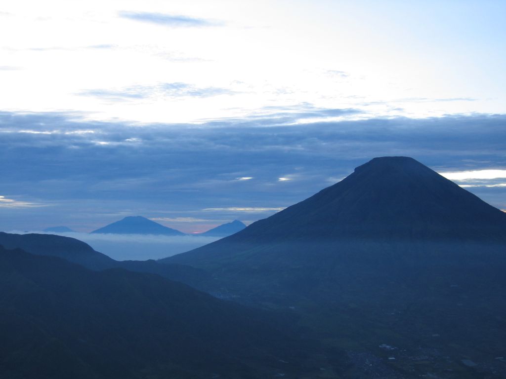 Am nächsten Morgen stand ich um halbvier auf und um 4 ging es los. Wie sich zeigte war ich allein mit dem Guide unterwegs. Anscheinend verirrten sich sonst keine Touristen nach Dieng. Der Guide (Ratno) erzählte mir, dass seit den Anschlägen auf Bali und Jakarta die Touristenzahl um über die Hälfte zurück ging. Wir plauderten nett (er sprach gut englisch) und marschierten 5 km zu einem Aussichtspunkt wo ich mir den Sonnenaufgang ansehen konnte.