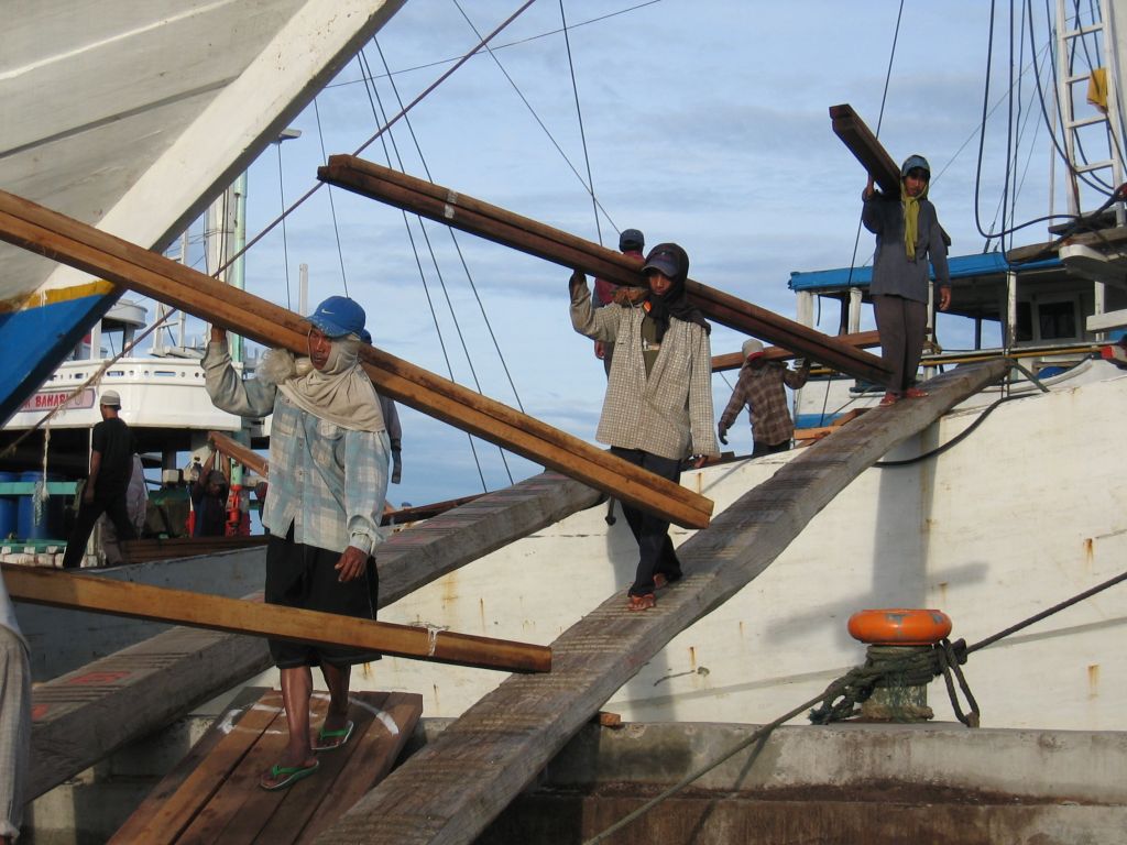 Auf dem Hafengelände lief ich umher und beobachtete, wie die Arbeiter Holz aus den großen Holzsegelbooten entluden.