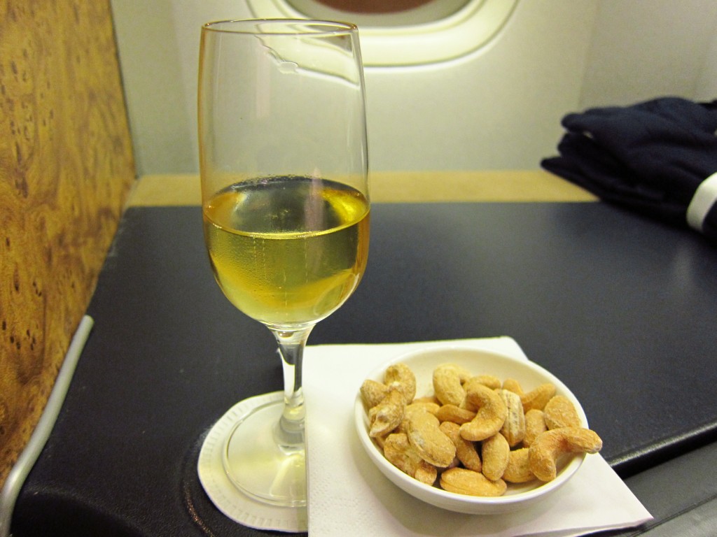 Hier nun einige Eindrücke vom Flug. Champagner (Laurent-Perrier Brut Millésimé 2000), Appetithäppchen und ein Täschen mit Allem, was Mann für einen langen Flug benötigt.