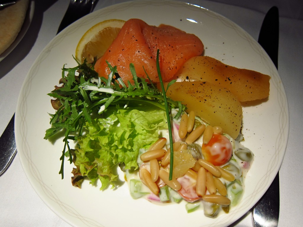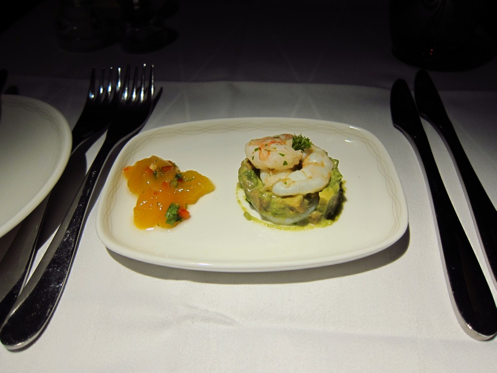 Nach der Zwischenlandung in Bahrain hatte sich das Flugzeug etwas gefüllt. Die First Class war mit 7 Passagieren halbvoll. Jetzt gab es auch das Abendessen.