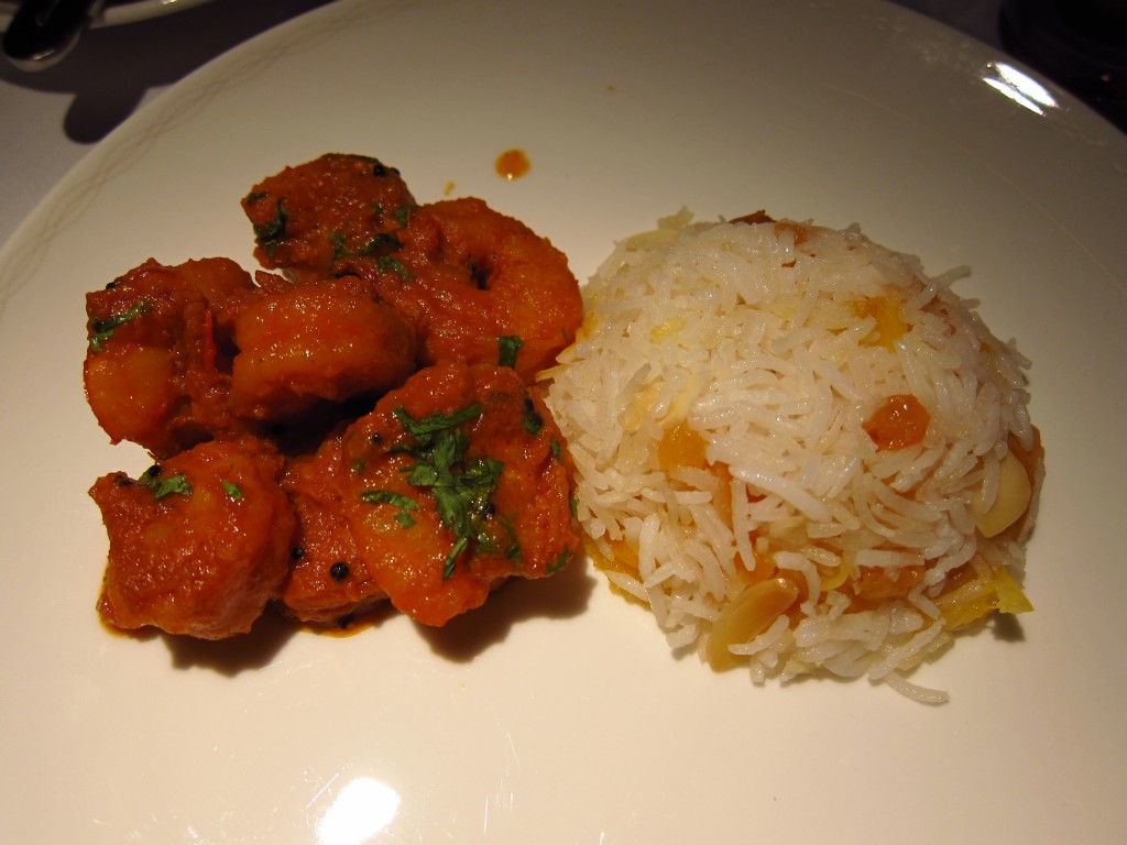 Mild coconut prawn green curry, Kashmiri rice pilaf and poppadoms
