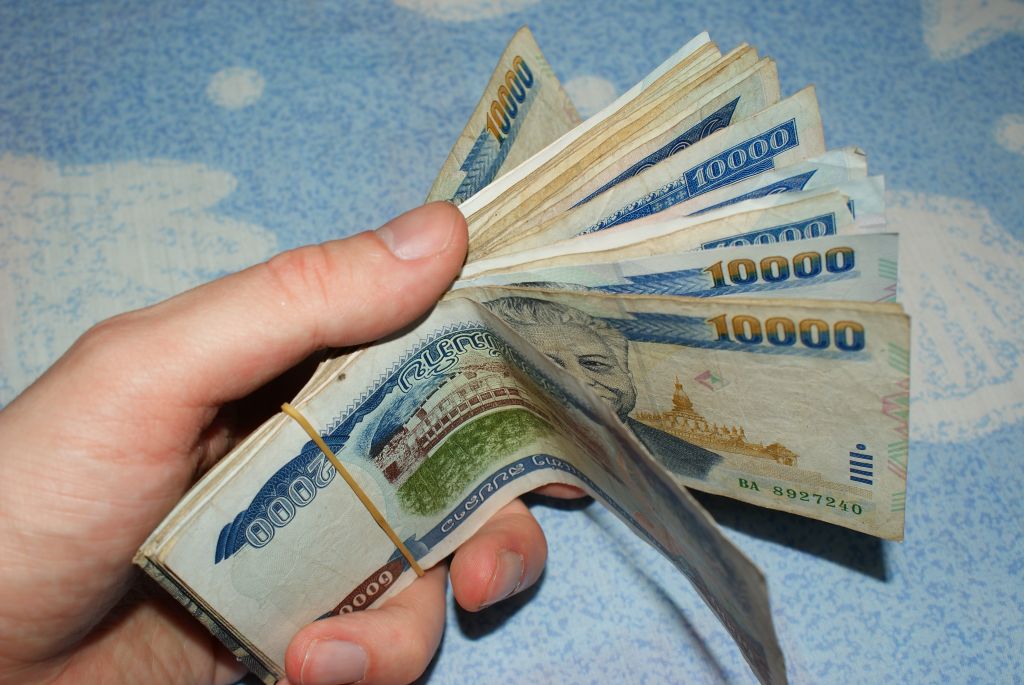 Laotisches Geld gibt es hier in dicken Bündeln. Auf dem Foto ist der Gegenwert von ca. 20€ zu sehen. Für diesen Betrag erhält man zur Zeit 242.000 Kip. Ein ausgezeichner Wechselkurs also!