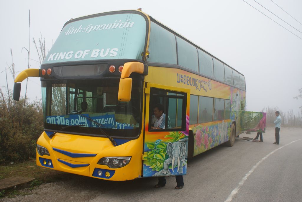 Vientiane verließ ich gleich am nächsten Tag wieder. Am Nachmittag und Abend des Vortages regnete es und auch morgens war es stark bewölkt und es sah nach schlechtem Wetter aus. Ich beschloss, die Weiterreise anzutreten. Die Fahrt von Vientiane nach Luang Prabang war überraschend angenehm. Der Bus war relativ modern und da er nur zur Hälfte gefüllt war, hatte ich zwei Sitze für mich allein. Wir sind um 8 Uhr morgens losgefahren und ca. 9 Stunden später in Luang Prabang angekommen. Die Fahrt führte die ersten vier Stunden auf einer großteils geraden Straße, im zweiten Abschnitt des Wegs wurde das Gelände gebirgig und die Straße kurvenreich.