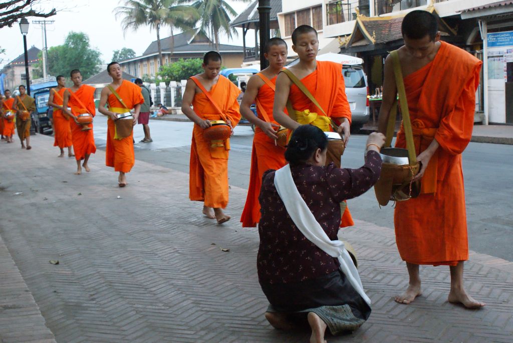 Früh morgens dann marschieren die Mönche aus den einzelnen Tempeln durch die Straßen von Luang Prabang und erhalten von den Einwohnern (und neuerdings auch von Touristen) Reis und andere Lebensmittel. Die Mönche jeder Tempelanlage gehen dabei geschlossen in einer Reihe hintereinander. Die älteren Mönche zu Beginn und die jüngeren Mönche und Kinder am Ende. Das ganze Spektakel beginnt ungefähr um 5:45 morgens und ist eine halbe Stunde später bereits zu Ende.