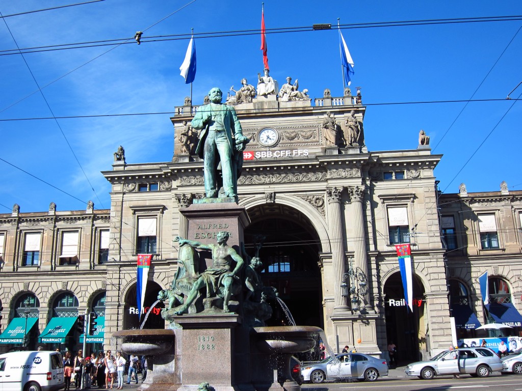 Der Züricher Hauptbahnhof, von welchem nicht nur alle Züge abfahren, sondern auch zahlreiche S-Bahn- und Straßenbahnlinien zusammentreffen.