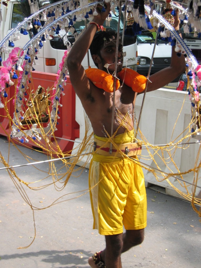 Heute habe ich wieder gesehen, dass Singapur eine Stadt der Gegensätze ist. Eine moderne Metropole mit einer beeindruckenden Skyline. Der reichste Staat Südostasiens. High-Tech Industrie. Und hunderten von indischen Gläubigen, die sich Nadeln und Haken in den Körper stechen und dann 4 km von einem Tempel in Little India zu einem anderen in der Nähe der Orchard Road laufen.