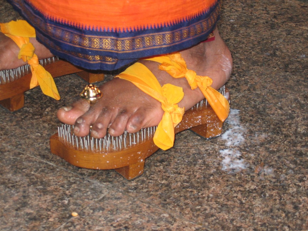 Im Temepel wurden die Gläubigen vorbereitet auf den Marsch. Zunächst wurden die riesigen Gestelle auf die Körpergröße angepasst, danach wurden die ganzen Metallstäbe in den Körper gesteckt. Mir hat das beim Zusehen wahrscheinlich mehr weh getan als denen. Ich habe gelesen, dass sie durch Mediation in einen Zustand kommen, in welchem sie keinen Schmerz mehr fühlen. Außerdem fließt auch kein Blut aus den Wunden.