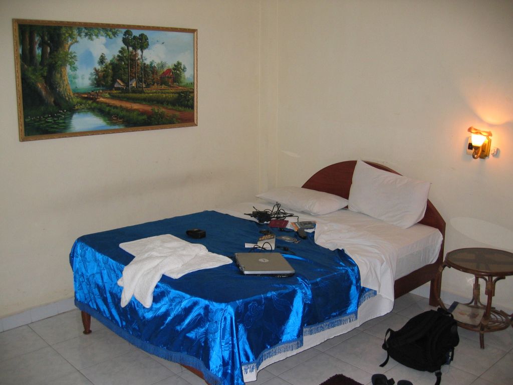 Abends war ich noch ein bisschen am Tonlé Sap River spazieren. Die Hauptstraße ist voll von Hotels, Restaurants und Internet-Cafés. Und es waren überall sehr viele Menschen unterwegs. Die Internetcafés hier kosten nur 50 cent/h. Dafür ist das Essen relativ teuer. In den Restaurants zahlt man 2 bis 4 US$ pro Gericht. Das heißt die Preise sind höher als in allen anderen asiatischen Ländern in denen ich unterwegs gewesen bin. Ich hatte einen Tisch draußen an der Hauptstraße. Minütlich kamen Kinder vorbei, die Blumen verkauften, die einfach “nur so” bettelten, Mütter mit Kleinkindern die Geld wollten, Kinder die Zeitungen verkaufen usw. Eine Mutter mit ihrem Kleinkind setzte sich auf den Bürgersteig direkt vor mich und schaute mir beim essen zu. War ein sehr unangenehmes Gefühl. Nach dem Essen hab ich bisschen Geld in kleinere Scheine gewechselt damit ich den Bettlern etwas geben kann.