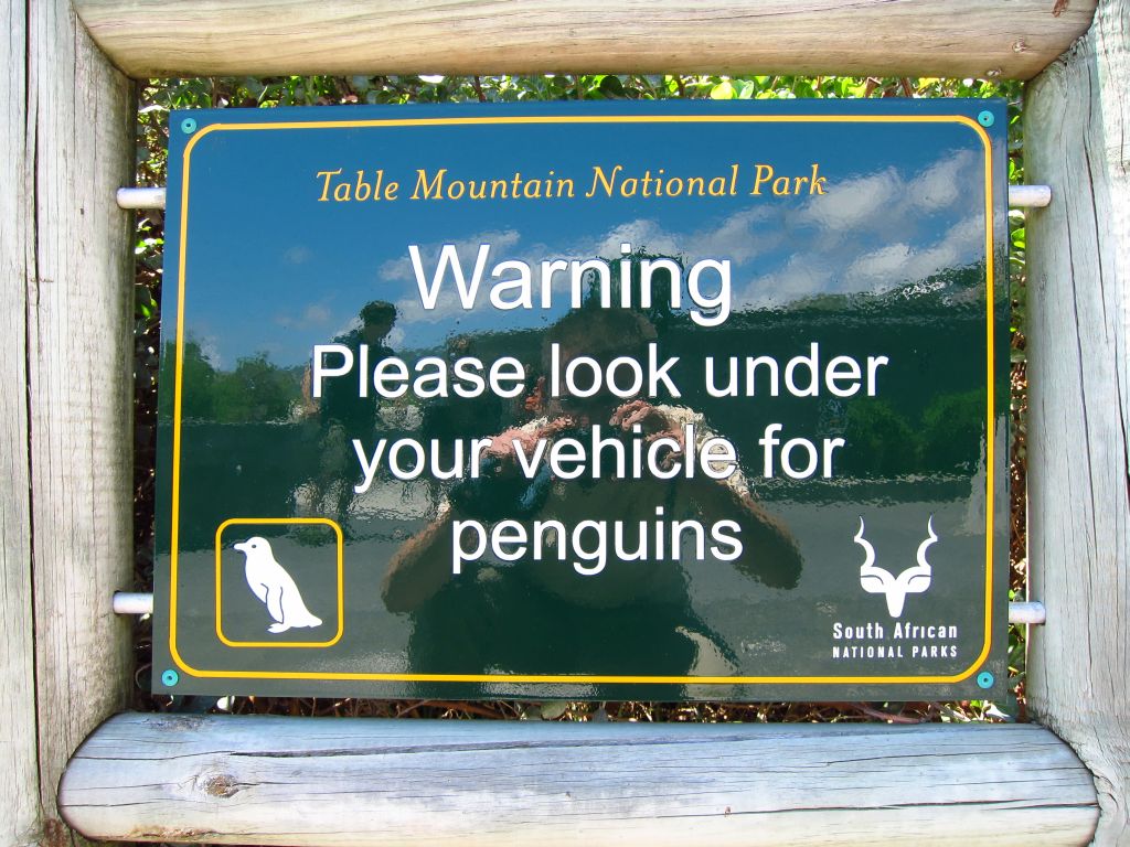 Auf der Kaphalbinsel leben afrikanische Pinguine (auch Jackass-Pinguine genannt, da sie Laute wie Esel von sich geben). Offenbar verstecken sie sich gerne unter den Autos der Besucher. Daher dieses wichtige Hinweisschild.