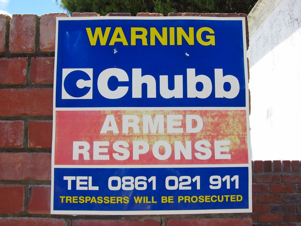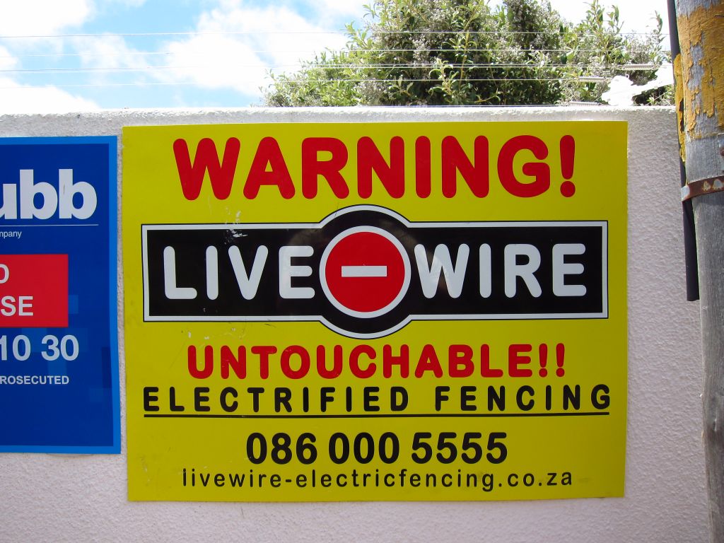 In der Nähe des Boulders Beach habe ich die folgenden beiden Schilder fotografiert. Grundstücke in Südafrika sind in den allermeisten Fällen geschützt durch hohe Mauern, Stacheldraht, Alarmanlagen und/oder Wachmänner. Auch erhält man in den meisten Hotels zum Zimmerschlüssel eine Fernbedienung für das elektrische Tor. Damit gelangt man auf das Hotelgrundstück und kann dort sicher parken.