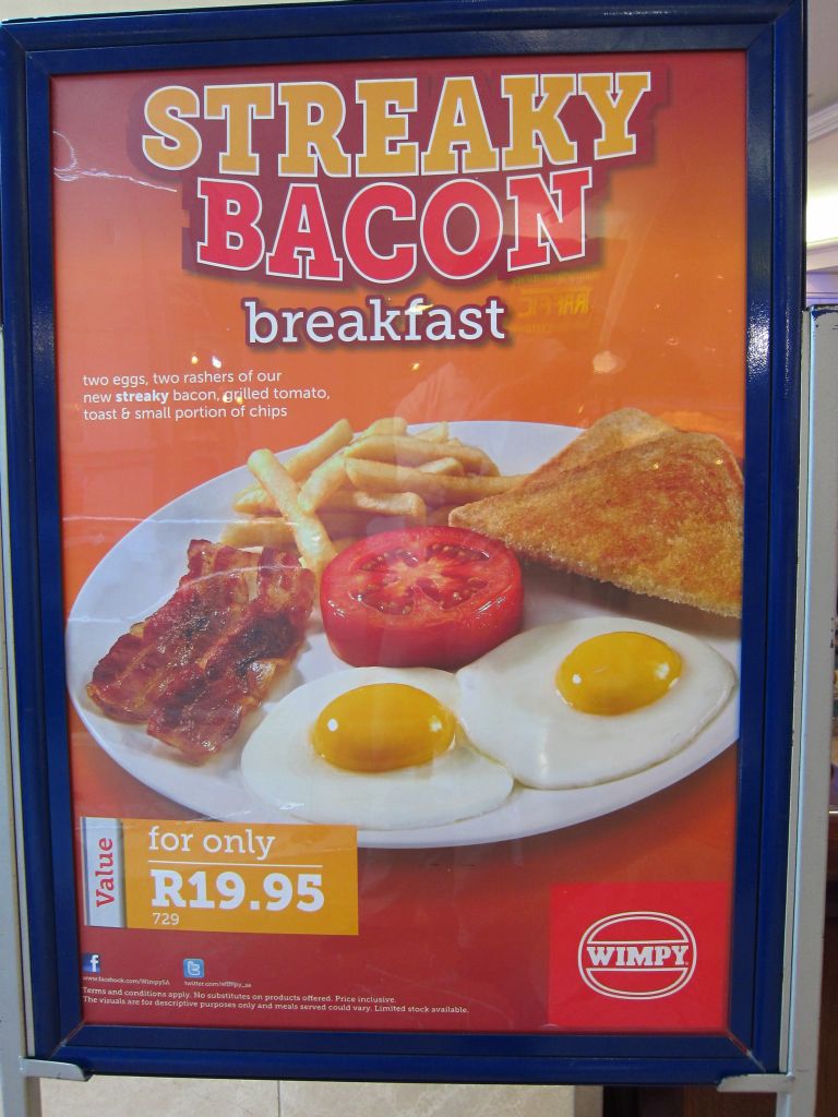 Da ich zu viel Reise und daher während meiner Reisen auf meine Ausgaben achten muss, aß ich häufig morgens, mittags und abends das “Spar-Frühstück” bei der englischen Fast-Food Kette Wimpy. Für 20 Rand, also ca. 1,80 € erhielt ich einen Teller mit zwei Streifen Speck, zwei Eiern, ein paar Pommes Frites, zwei Scheiben Toast und etwas Butter und Marmelade. Ein sagenhaftes Preisleistungsverhältnis.